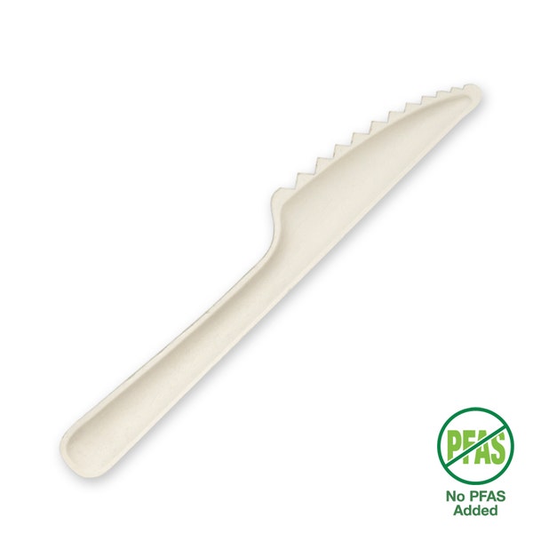BioPak plant fibre knife is made from rapidly renewable sugarcane pulp, a by-product of the sugar refining industry. Bagasse cutlery is certified home compostable to Australian AS5810 standards, made with no added PFAS.